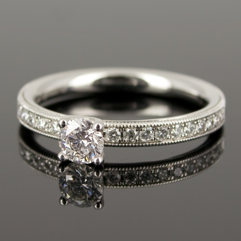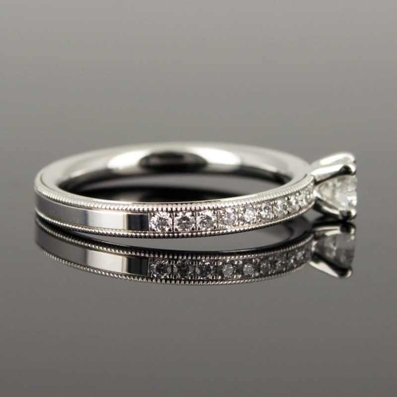 Zahlreiche und liebevoll gestaltete Details machen das Modell zu einem ganz besonderen Antragsring. Im Zentrum funkelt ein Drittelkaräter (Brillant 0,33ct), der von 4 Krappen sicher gehalten wird. Zwanzig zusätzliche seitlich gefasste Brillanten mit einen Gesamtgewicht von 0,22ct verstärken diesen Eindruck. Die Seiten des Ring sind fein perliert (Milgrain oder Millgriff Design). Der Ring ist kräftig und ca. 2,5mm breit.